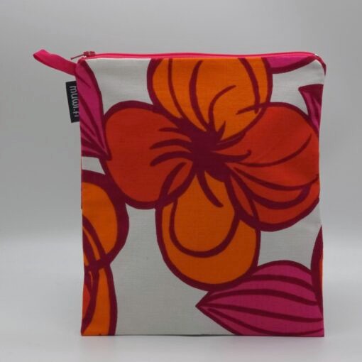 Päällinen puuvillaa, vuori pinnoitettua polyesteria. Koko n.21×25 cm. Kosteudenpitävä pussukka, ripustuslenkillä, soveltuu esim. uikkareiden kuljettamiseen.