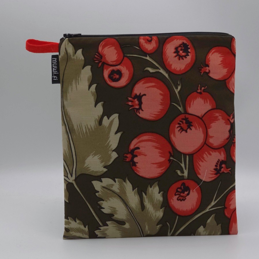 Päällinen puuvillaa, vuori pinnoitettua polyesteria. Koko n.21×25 cm. Kosteudenpitävä pussukka, ripustuslenkillä, soveltuu esim. uikkareiden kuljettamiseen. Herukka-kuosia, Tampella.