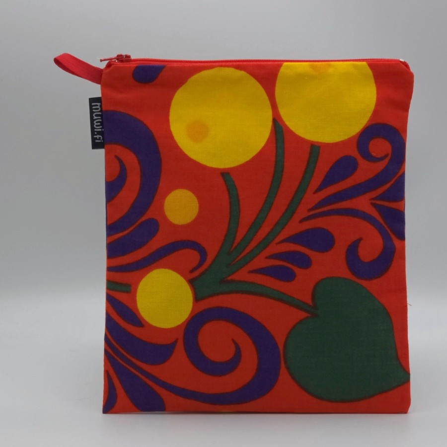 Päällinen puuvillaa, vuori pinnoitettua polyesteria. Koko n.21×25 cm. Kosteudenpitävä pussukka, ripustuslenkillä, soveltuu esim. uikkareiden kuljettamiseen. Unkari-kuosi.