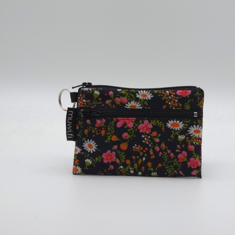 Valmistettu kierrätyspuuvillasta koko n.13x9cm. Puuvillavuorattu pussukka, sivussa tasku kolikoille. Tähän mahtuu kortteja, sekä setelit ja kolikot.