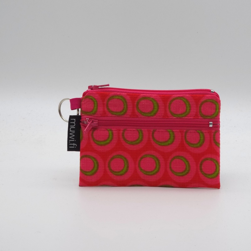 Valmistettu kierrätyspuuvillasta koko n.13x9cm. Puuvillavuorattu pussukka, sivussa tasku kolikoille. Tähän mahtuu kortteja, sekä setelit ja kolikot.