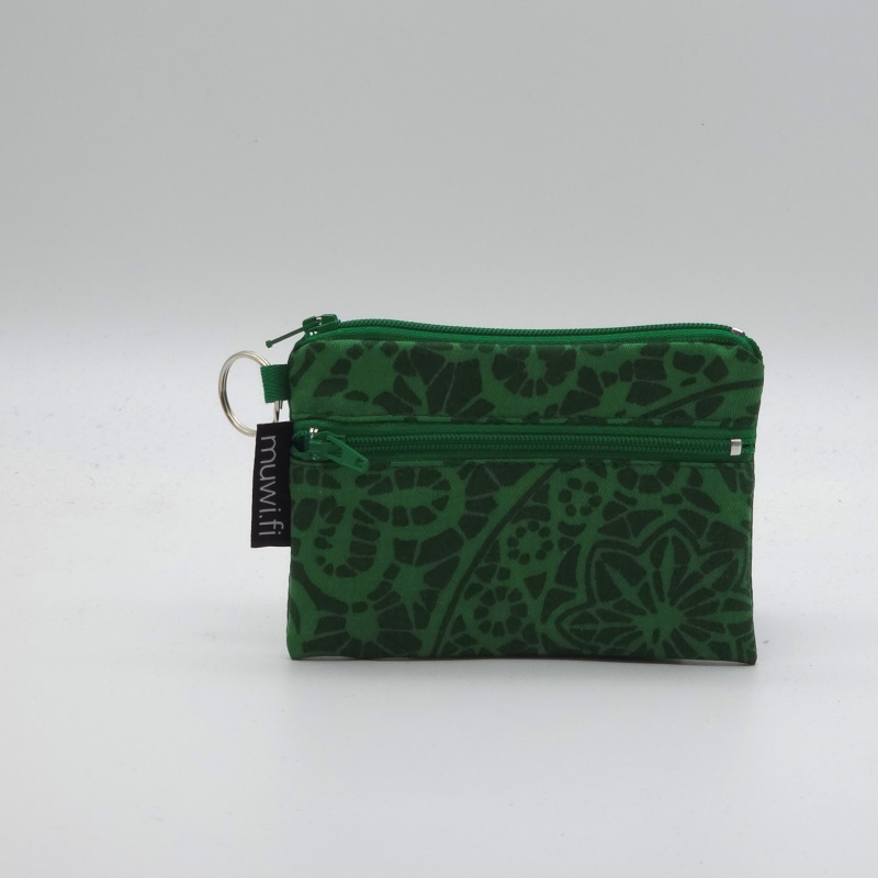 Valmistettu kierrätyspuuvillasta koko n.13x9cm. Puuvillavuorattu pussukka, sivussa tasku kolikoille. Tähän mahtuu kortteja, sekä setelit ja kolikot. Marjatta Metsovaaran Tampellalle suunnittelemaa Pitsi-kuosia.