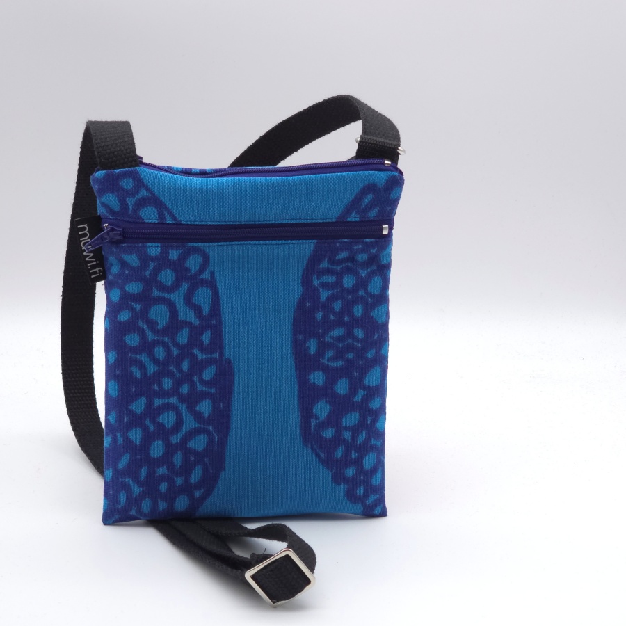 Pienen olkalaukun koko on n.16x20cm, sivussa lähes laukun syvyinen vetoketjutasku. Laukku on puuvillaa, puuvillavuorilla. Olkahihna säädettävissä 75-150cm. Tähän mahtuu vaikka kännykkä, avaimet ja kukkaro. Lena Rewellin kuosi.