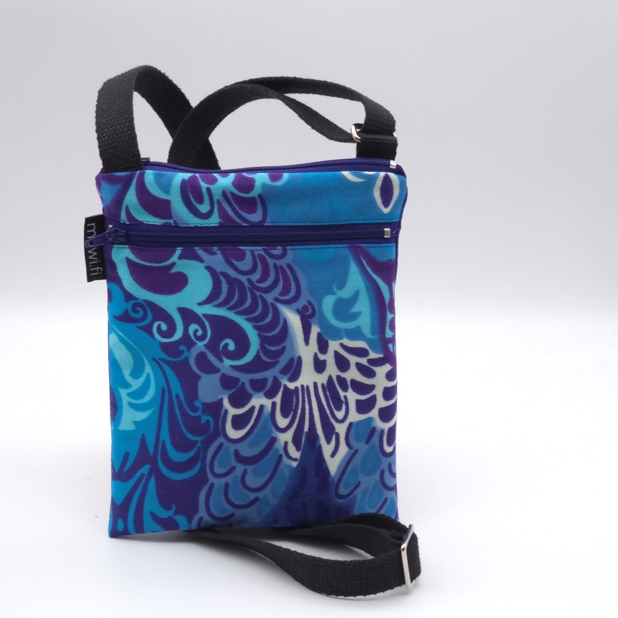 Pienen olkalaukun koko on n.16x20cm, sivussa lähes laukun syvyinen vetoketjutasku. Laukku on puuvillaa, puuvillavuorilla. Olkahihna säädettävissä 75-150cm. Tähän mahtuu vaikka kännykkä, avaimet ja kukkaro. Marjatta Metsovaaran Pitsi-kuosia, Tampella.