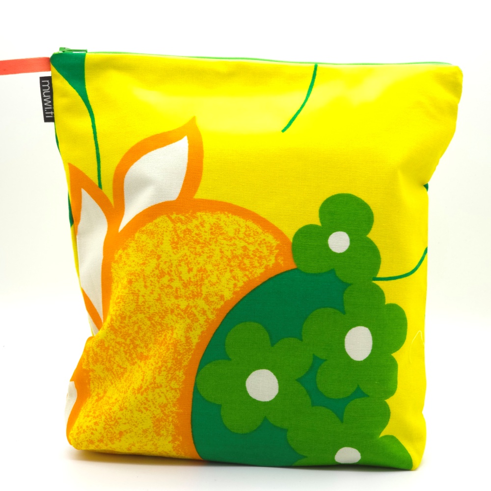 Päällinen puuvillaa, vuori pinnoitettua polyesteria. Koko n.31×35 cm, josta pohjan syvyys n.5cm Kosteudenpitävä pussukka, ripustuslenkillä, soveltuu esim.käsitöiden kuljettamiiseen (puikot eivät tule läpi tiiviistä vuorikankaasta).