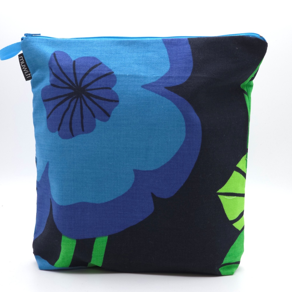 Päällinen puuvillaa, vuori pinnoitettua polyesteria. Koko n.31×35 cm, josta pohjan syvyys n.5cm Kosteudenpitävä pussukka, ripustuslenkillä, soveltuu esim.käsitöiden kuljettamiiseen (puikot eivät tule läpi tiiviistä vuorikankaasta).